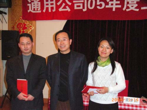 尹纯董事长发言之后,大会又对2005年度业绩突出的优秀员工进行了表彰。董事长亲自为优秀员工颁奖。本年度优秀员工是公司全体员工共同投票,并由行政部门统计选举出来的。尹纯董事长指出,2005年度,通用公司的每位员工工作都是认真、努力的,为公司的发展做出了各自的贡献。本次推选出的人员,只是其中的代表。尹纯董事长希望,在新的一年里,能有更多的人员以业绩说话,来角逐优秀员工这一荣誉。颁奖后,优秀员工代表也作了发言,感谢公司给予的荣誉,并表示要在2006年里再接再厉,为公司做出更多贡献。